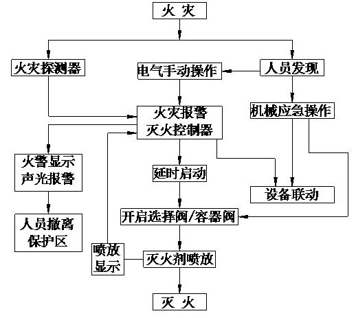 當(dāng)兩種探測器發(fā)出火災(zāi)信號時,控制主機(jī)啟動警鈴和聲光報警器,聯(lián)動關(guān)閉防護(hù)區(qū)開口,進(jìn)入滅火啟動延時,達(dá)到設(shè)定的延時時間后,自動啟動滅火系統(tǒng)。